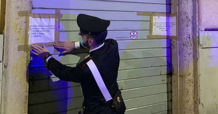 Gli stessi Carabinieri della Stazione Roma Macao hanno poi chiuso, sempre per 5 giorni, un bar di Via Cernaia. I militari hanno sorpreso ben 15 persone all’interno del locale, 8 delle quali erano sedute ai tavoli del piano seminterrato dell’esercizio, tutte senza indossare mascherine protettive e senza mantenere il distanziamento tra loro.