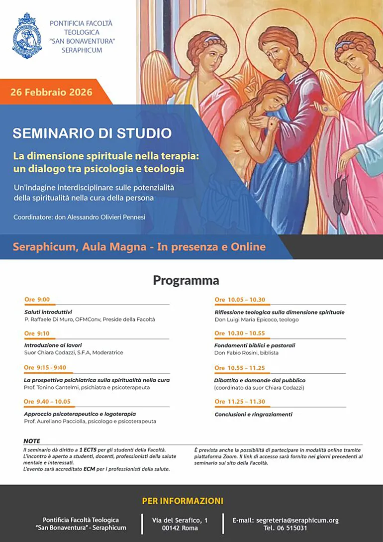 Roma. Giovedì 26 Febbraio nell’Aula Magna del Seraphicum seminario di studio su “La dimensione spirituale nella terapia: un dialogo tra psicologia e teologia”