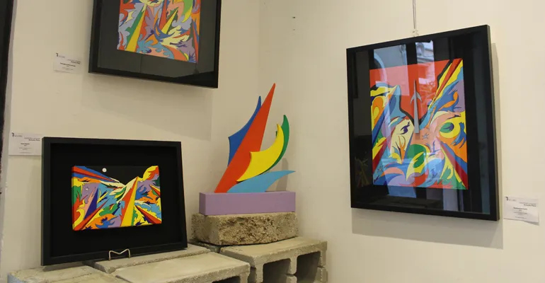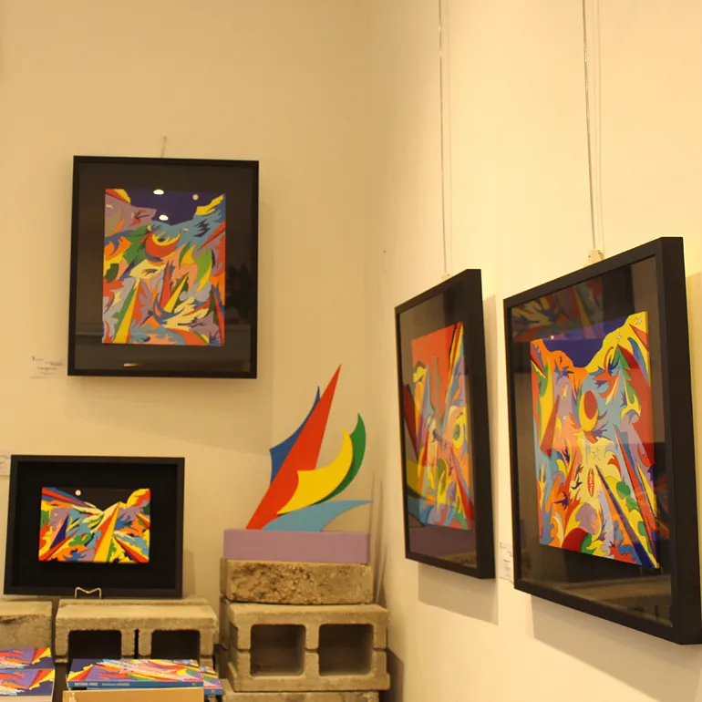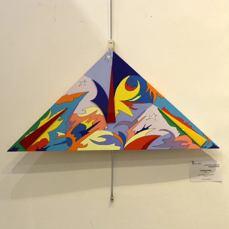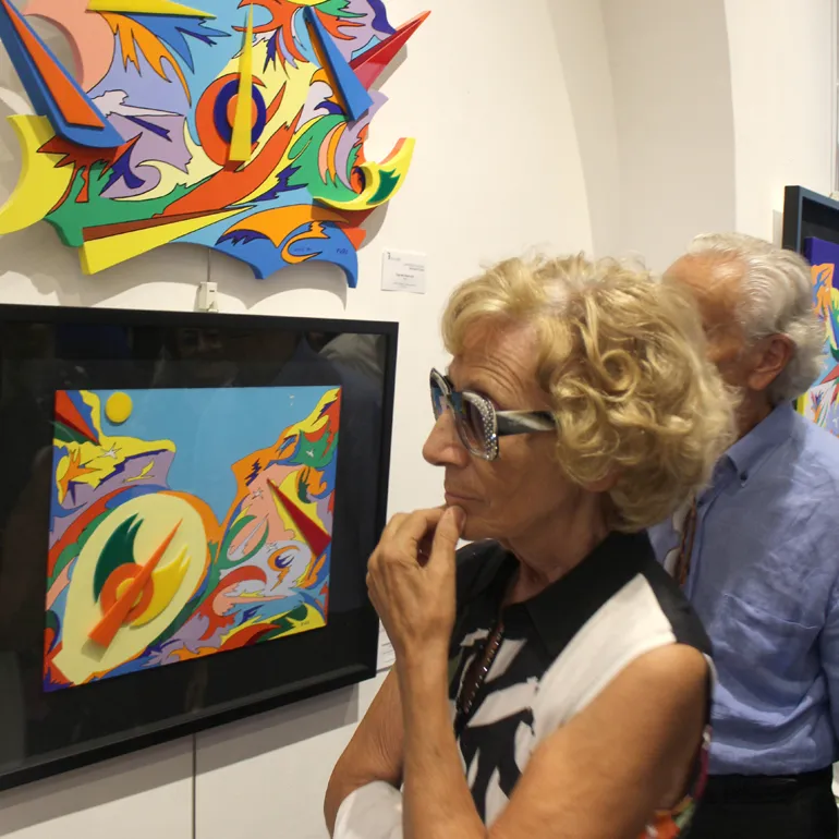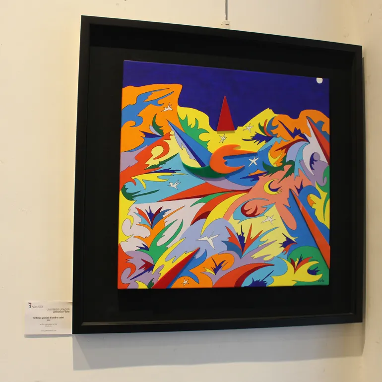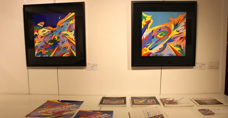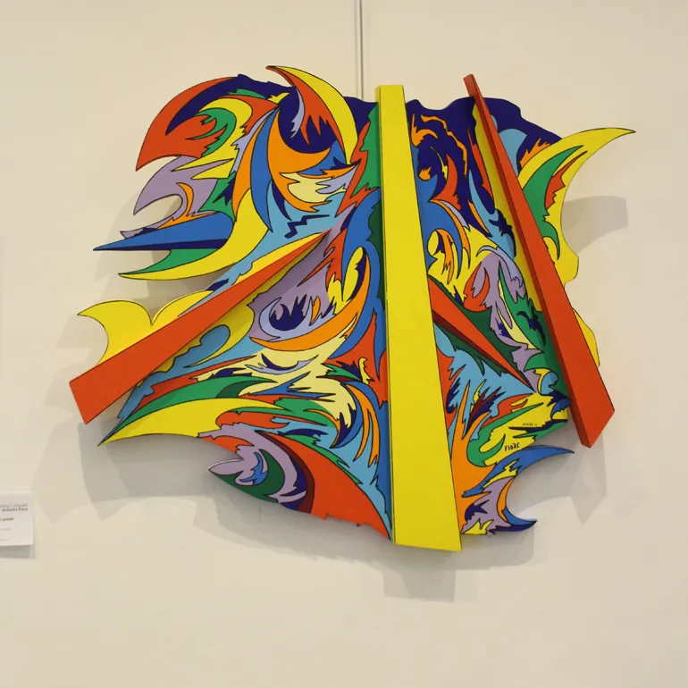 Colori accesi e forme geometriche dinamiche che da sempre contraddistinguono l’opera di Antonio Fiore, un suo linguaggio evocativo e d’impatto con cui esprimere la propria visione dello spazio, anche se non mancano opere dedicate al “sacro”.
