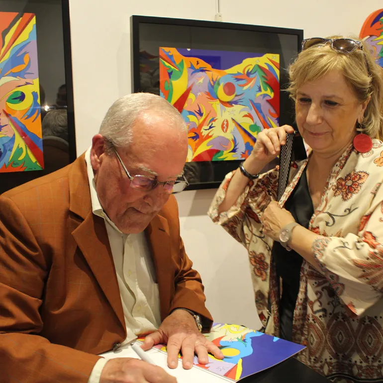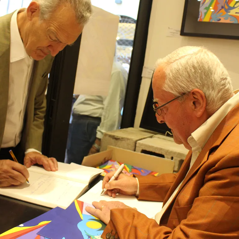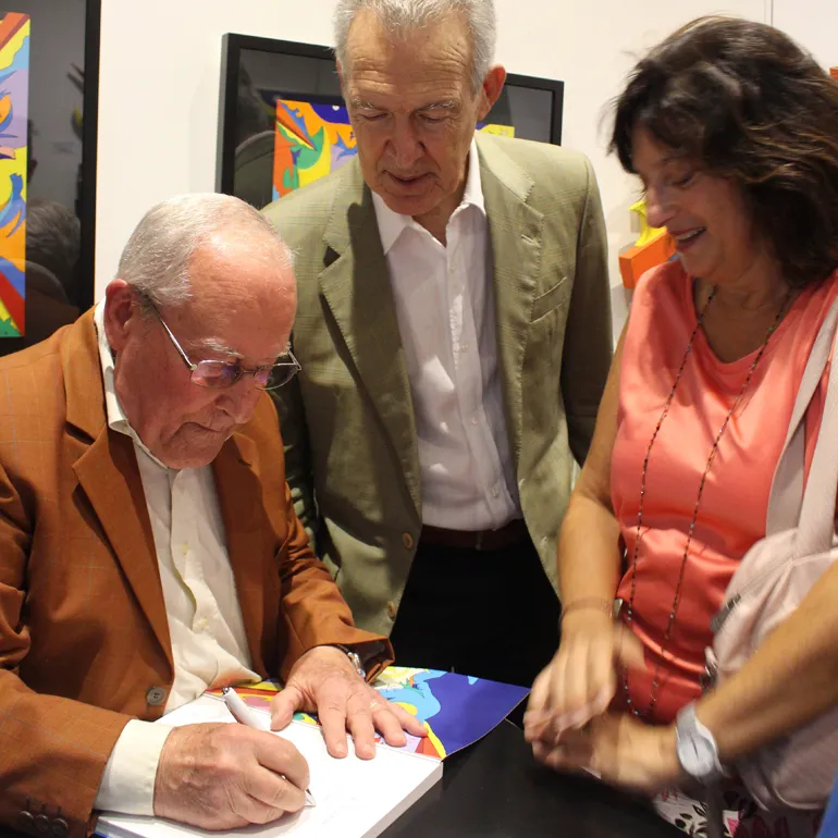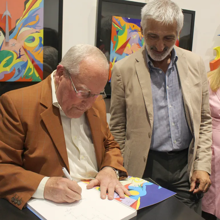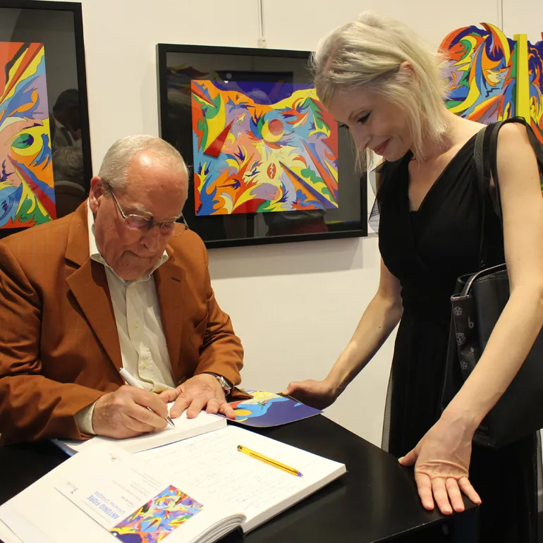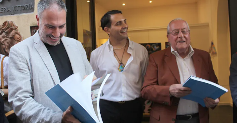 A seguire l’artista ha fatto dono ad ognuno dei presenti, con tanto di dedica personalizzata, del Catalogo monografico, curato da Tiziano M. Todi ed edito da Gangemi Editore Internazional con i testi di Giorgio Di Genova, Andrea Baffoni, Tiziana Todi.