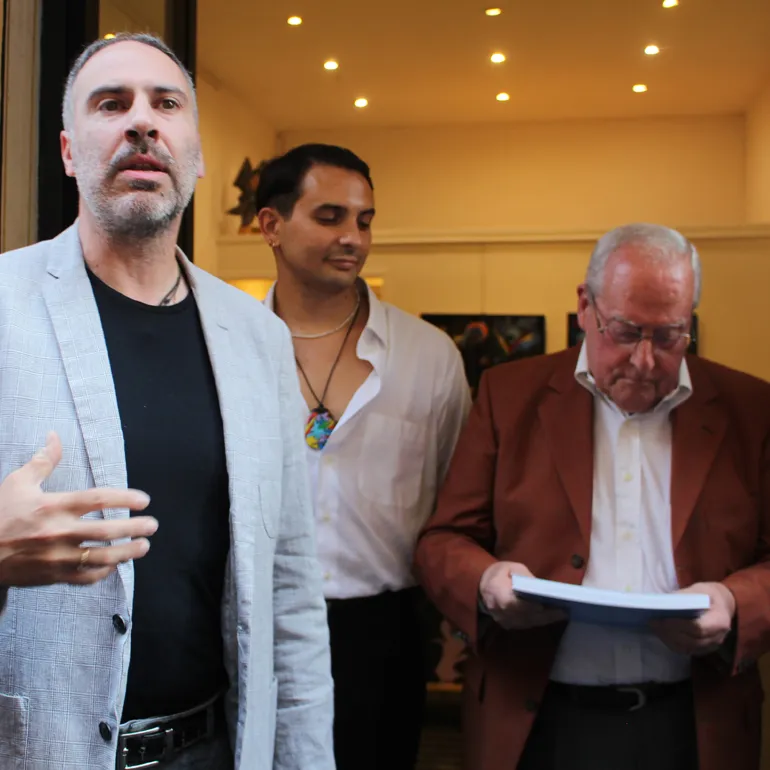 Andrea Baffoni, studioso d’arte contemporanea ed esperto di futurismo, ha voluto soffermarsi sull’opera dell’artista, sintetizzando come «Antonio Fiore è riuscito, attraverso la sua spontaneità, di un uomo che è uomo prima di essere artista e non sembra e non è una banalità, sembra banale da dire, ma non lo è perché Antonio Fiore ha mantenuto nel suo lavoro artistico quella spontaneità del fanciullo che lo ha portato a sorprenderci continuamente, a sorprendere e la vostra presenza così nutrita lo testimonia.