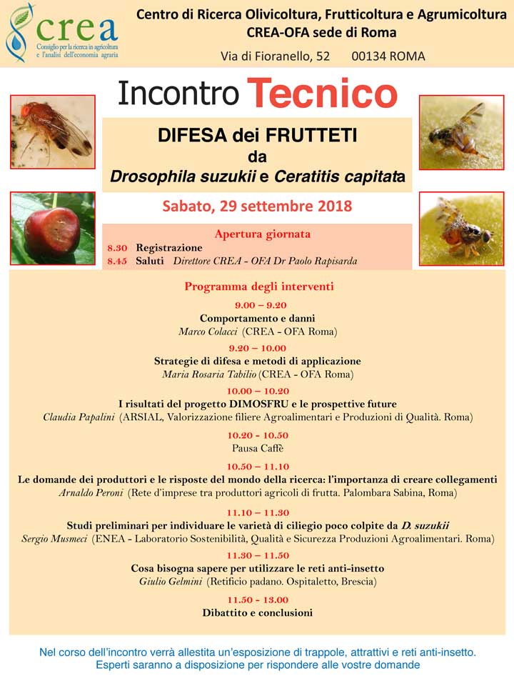 Roma. Incontro Tecnico e Mostra del 29 Settembre presso il Crea: «Difesa dei frutteti da Drosophila suzukii e Ceratitis capitata»