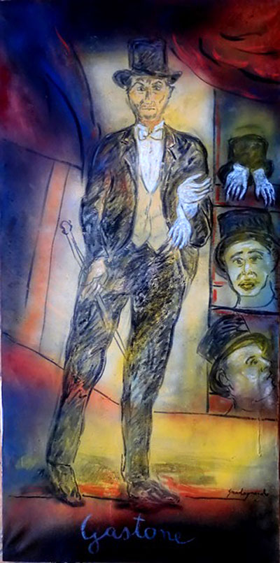 L’opera dai colori forti e contrastanti, bene è riuscito l’artista ad impersonare il modo di porsi di Proietti, che interpreta “Gastone” ormai annoiato, frustrato dalla vita, soprattutto nostalgico e abbandonato, pertanto in declino, che crede di essere ancora un divo. Anche se “Gastone” racconta la società dello spettacolo degli anni ’30, possiamo definirlo un personaggio tanto attuale a ben vedere ciò che accade nella vita di tutti i giorni, spesso ridicola, in una società costruita sull’esteriorità, che si manifesta nella ricerca ansiosa dell’affermazione.