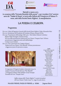 ROMA – In occasione della “Giornata Mondiale della poesia” e per ricordare il 60° anniversario dei “Trattati di Roma”, è stata tenuta, con successo, nella Galleria del Primaticcio di Palazzo Firenze di Roma, sede della Società Dante Alighieri, una manifestazione, dedicata a “La Poesia e l’Europa”.