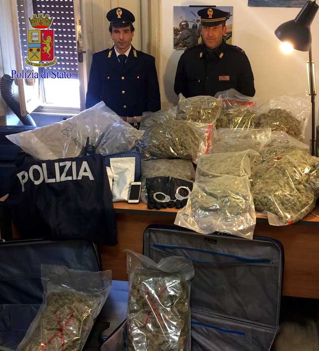 A questo punto i poliziotti, fingendosi operai del gas, sono entrati nell’appartamento scoprendo l’ingente quantitativo di droga. Nascoste infatti all’interno di 3 valigie, posizionate su un balcone, c’erano 14 confezioni in plastica ognuna delle quali conteneva oltre 1 Kg di marijuana.