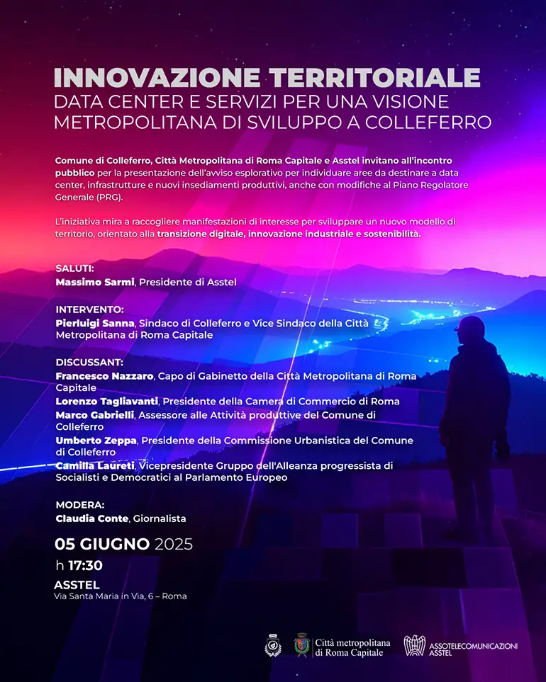 COLLEFERRO | ROMA – Giovedì 5 Giugno alle ore 17.30 – presso la sede di Asstel in via Santa Maria in Via 6, Roma – si terrà l’evento “Innovazione territoriale: Data Center e Servizi – Una visione metropolitana per lo sviluppo di Colleferro”, un’iniziativa dedicata alla valorizzazione del territorio attraverso l’innovazione digitale, infrastrutturale e sulla transizione ecologica.