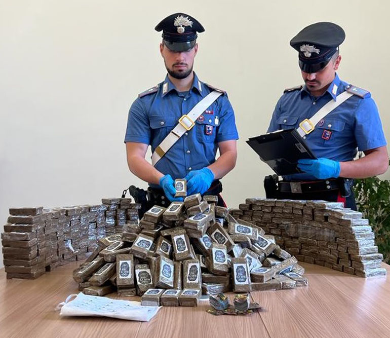Ispezionando i luoghi circostanti i Carabinieri hanno rinvenuto ulteriori 23,8 kg della medesima sostanza stupefacente, occultati in tre sacchetti posizionati nei pressi di un box auto mentre all’interno del medesimo garage hanno recuperato altri 24,7 kg sempre di hashish.