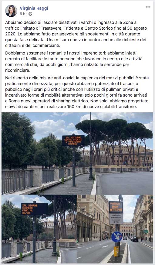 ROMA – «Abbiamo deciso di lasciare disattivati i varchi d’ingresso alle Zone a traffico limitato di Trastevere, Tridente e Centro Storico fino al 30 Agosto 2020. Lo abbiamo fatto per agevolare gli spostamenti in città durante questa fase delicata. Una misura che va incontro anche alle richieste dei cittadini e dei commercianti».