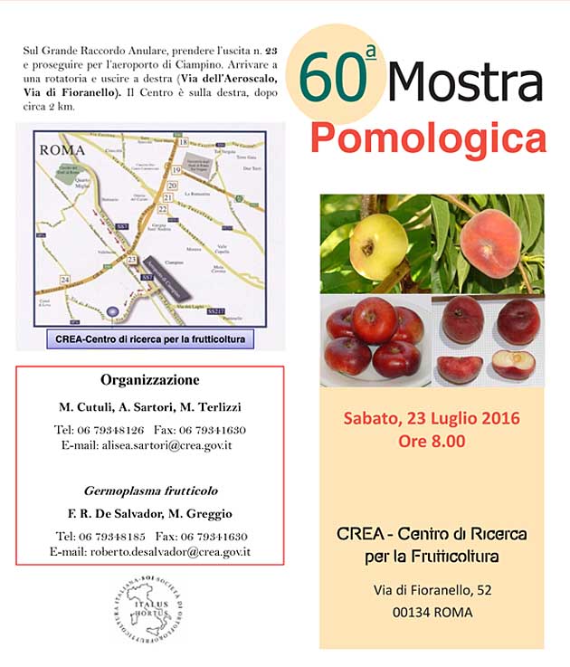 ROMA – Sabato 23 Luglio 2016, nel Centro di Ricerca per la Frutticoltura di Roma, in Via di Fioranello 52, dalle ore 8.00 alle 13.30, si terrà la “60^ Mostra Pomologica della frutta”, particolarmente interessante, e dove sarà possibile vedere centinaia di campioni di cultivar che maturano in questo periodo.