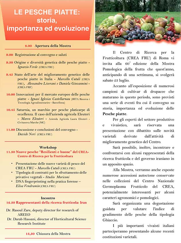 In contemporanea, dalle 9 alle 11, si terrà un convegno sulla storia, importanza ed evoluzione delle “Pesche piatte”, mentre, alle 11.30, verranno presentate le novità varietali, derivate dall’attività di miglioramento genetico del Centro.