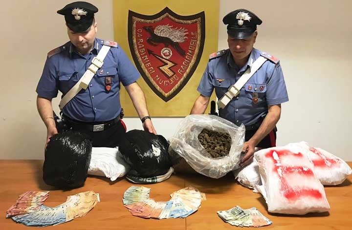 In una pertinenza della villetta in uso alla coppia, i Carabinieri hanno rinvenuto 19 Kg di marijuana, 8mila euro in contanti ritenuti provento della loro attività illecita, diversi bilancini elettronici e la contabilità di una fiorente attività di spaccio.