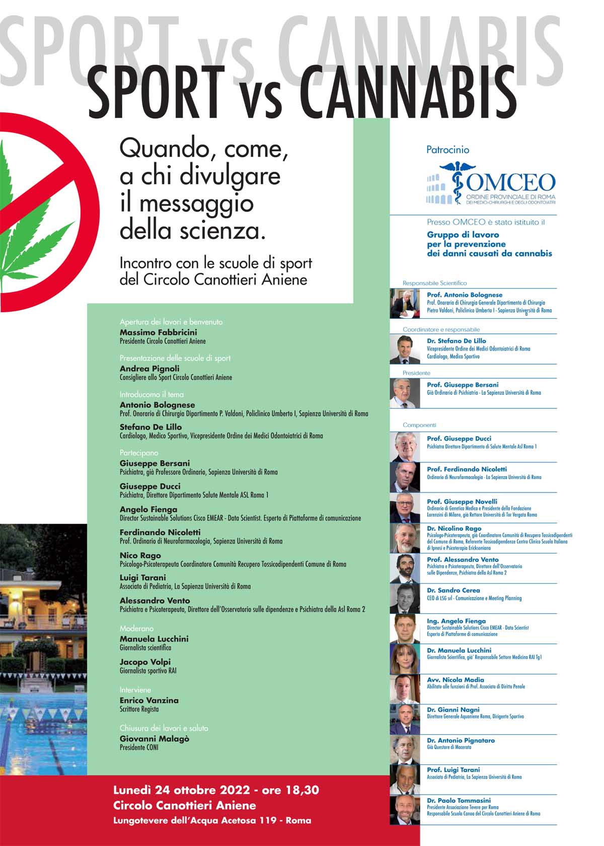 ROMA (Luciana Vinci) – Lunedì 24 Ottobre alle ore 18,30 al Circolo Canottieri Aniene – Lungotevere dell’Acqua Acetosa, 119 – si terrà un interessante Convegno dal titolo “Sport vs Cannabis” organizzato dalla Commissione dell’Ordine dei Medici di Roma.