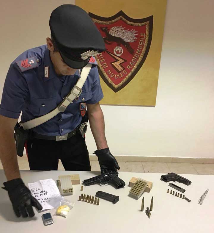 Nel corso della perquisizione, i Carabinieri hanno scoperto un vano, coperto da un pannello scorrevole in legno, ricavato nella cucina in muratura dell’abitazione e, una volta aperto, hanno rinvenuto: un involucro contenente 30 dosi di cocaina; un bilancino di precisione; una pistola Beretta calibro 7,65 completa di caricatore con 7 cartucce e una pistola Beretta 98 FS con matricola abrasa, completa di caricatore contenente 15 colpi, entrambe clandestine; 54 cartucce calibro 9×19.