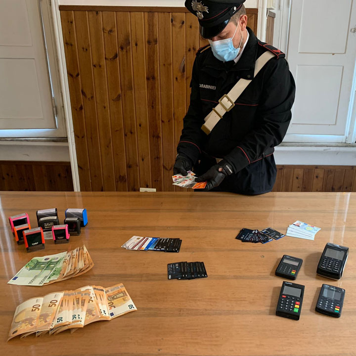 Nessuno dei fermati ha saputo giustificare il possesso di quanto trovato dai Carabinieri e così le verifiche si sono spostate nell’appartamento del cittadino romeno, nella stessa via, dove i Carabinieri hanno rinvenuto altro materiale: 36 carte magnetiche di diversi istituti di credito intestate a terze persone; 7.500 euro in contanti; 26 timbri di società con sedi legali in vari indirizzi di Roma; 4 Pos per pagamenti; 4 carte di identità rilasciate da Autorità rumene a cittadini rumeni.