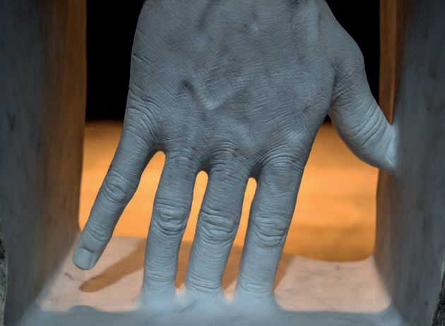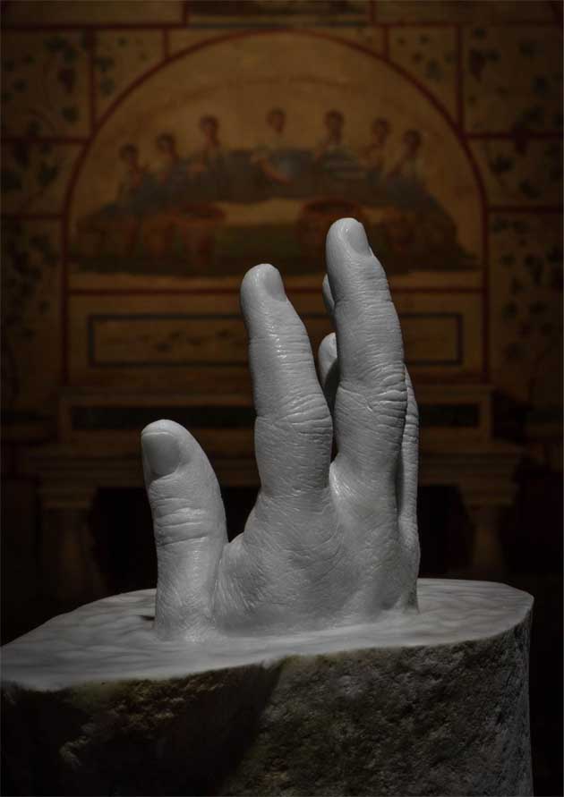 Scaglie di pietra, eterne nella loro essenza materica, assumono in sé la caducità della carne e marmoree mani, dall’impressionante forza vitale, suggeriscono solo ciò che già esiste: «tutto è contenuto».