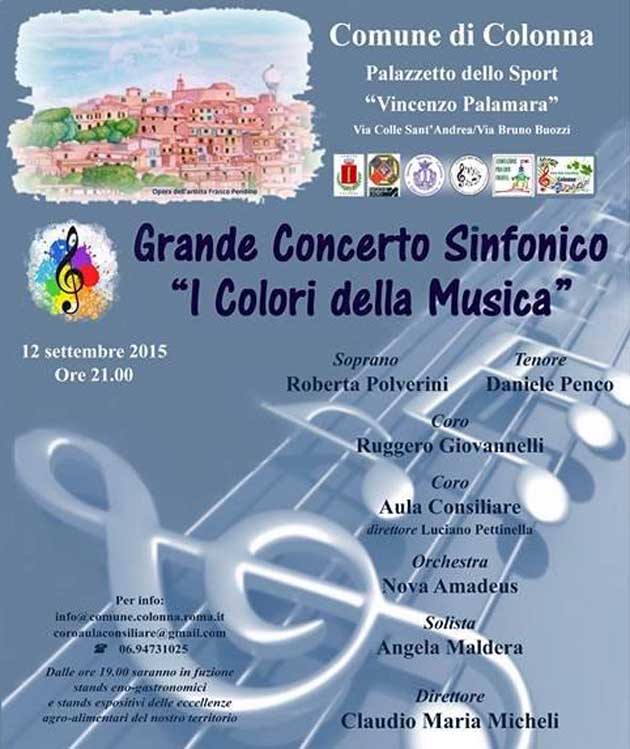 A COLONNA, Sabato 12 Settembre 2015, alle ore 21, nel Palazzetto dello Sport “Vincenzo Palamara”, via Colle Sant’Andrea / via Bruno Bozzi, si terrà il grande Concerto Sinfonico “I Colori della Musica”, ideato e organizzato dal brillante Direttore del Coro “Aula Consiliare”, Luciano Pettinella, in collaborazione con l’Amministrazione Comunale.