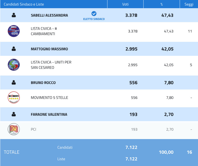 A San Cesareo alle ore 12 avevano votato il 21,04% degli aventi diritto, alle ore 19 il 45,39%, alle 23 le urne si sono chiuse registrando un’affluenza pari al 63,11%, il 4,73% in meno rispetto alle precedenti consultazioni elettorali comunali.
