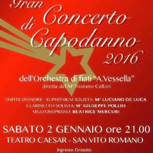 SAN VITO ROMANO (RM) – Si terrà oggi, Sabato 2 Gennaio alle ore 21 presso il “Teatro Caesar” di San Vito Romano, ad ingresso gratuito, il “Gran Concerto di Capodanno”, nell’ambito della VII Edizione della Notte di Natale organizzata dall’Amministrazione Comunale di San Vito Romano, un Istituto di Credito locale e la Pro Loco.