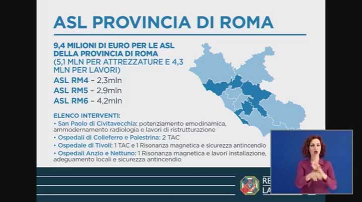 Su Roma città è prevista l’acquisizione di macchine di ultima generazione – angiografi, tac, risonanze magnetiche – per gli ospedali Sant’Eugenio, Cto, San Filippo Neri, Nuovo Regina Margherita, Sant’Andrea, Tor Vergata, San Camillo e Umberto I.