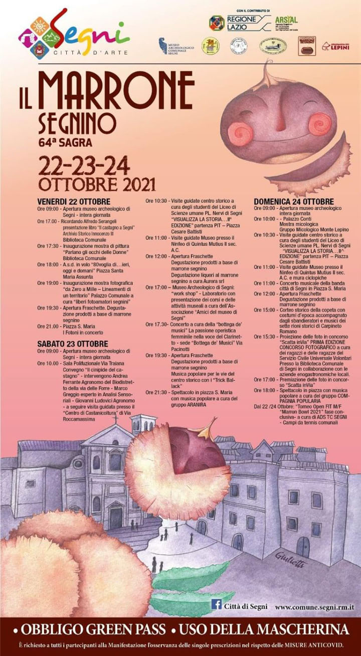 Variegato il programma di una festa che non si può solo raccontare, ma che va vissuta con entusiasmo: eno-gastronomia nelle classiche fiaschette dove saranno servite le prelibatezze della cucina segnina e sarà possibile degustare prodotti a base del pregiato frutto, tra i migliori per qualità dell’intera Italia; cultura con l’apertura del Museo archeologico e visita dello stupendo Ninfeo, la presentazione del libro “Il Castagno a Segni”, nel ricordo di Alfredo Serangeli, Direttore dell’Archivio storico Innocenzo III da poco scomparso, la possibilità di poter ammirare gli splendidi quadri della Mostra di Pittura “Parlano gli occhi delle donne” presso la Biblioteca Comunale, mentre presso il Palazzo Comunale sarà possibile ammirare gli scatti dei “Liberi fotoamatori segnini” dedicati al territorio.