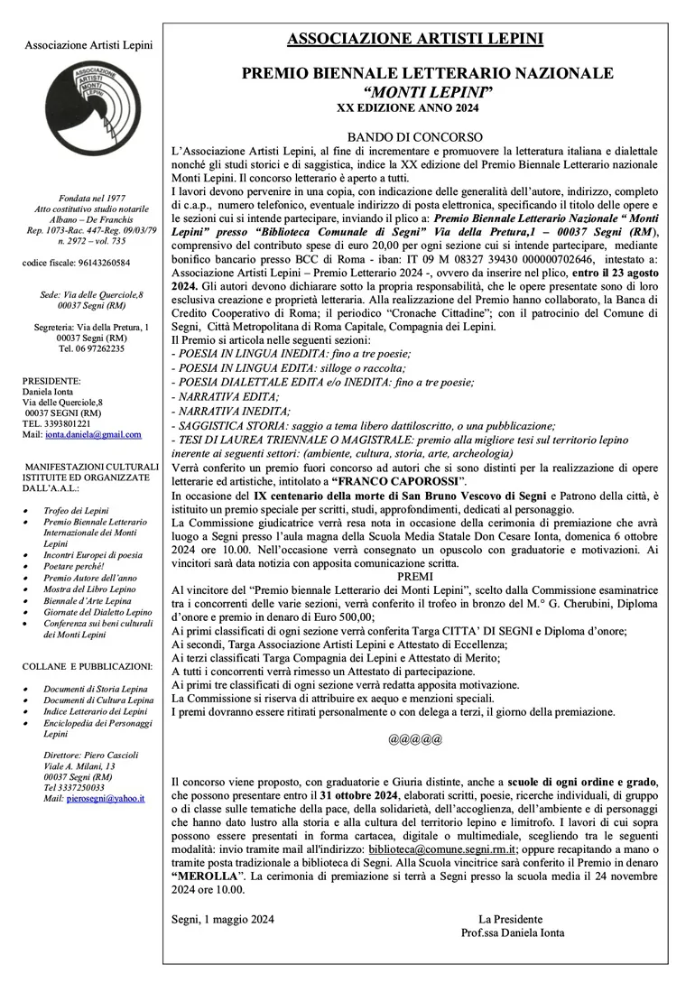 Premio Biennale Letterario Nazionale “ Monti Lepini” presso “Biblioteca Comunale di Segni” Via della Pretura, 1 – 00037 Segni (RM), comprensivo del contributo spese di euro 20 per ogni sezione cui si intende partecipare, mediante bonifico bancario presso BCC di Roma – Iban: IT09M0832739430000000702646, intestato a: Associazione Artisti Lepini – Premio Letterario 2024 -, ovvero da inserire nel plico, entro il 23 Agosto 2024.