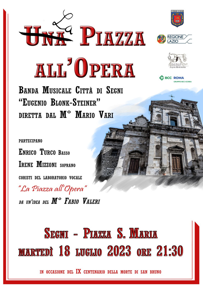 SEGNI – Il tradizionale concerto della banda musicale che si tiene a Segni per la Festa di San Bruno quest’anno sarà caratterizzato dal progetto “Una Piazza all’Opera” o, per meglio dire “LA” Piazza all’Opera.