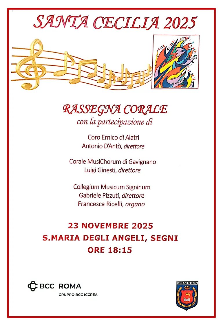 SEGNI – In occasione della Festa di Santa Cecilia, patrona della musica e dei musicisti, la città di Segni si prepara ad accogliere un evento di grande spessore artistico e spirituale: una Rassegna Corale che si terrà Domenica 23 Novembre 2025 presso la Chiesa di Santa Maria degli Angeli, con inizio alle ore 18:15.