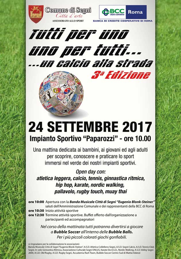 SEGNI (RM) – Torna Domenica 24 Settembre, la grande giornata di Sport ai campi sportivi di Segni “Tutti per uno, uno per tutti… Un calcio alla strada”.
