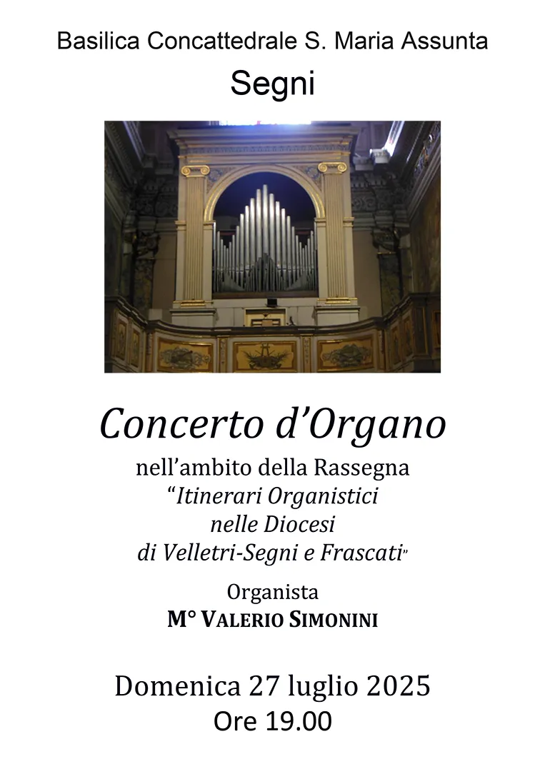 SEGNI (Eledina Lorenzon) – Domenica 27 Luglio alle ore 19, nella Concattedrale di Santa Maria Assunta in Segni, si terrà il Concerto d’Organo del M° Valerio Simonini, vincitore del Premio “Morettini” nella I Edizione del Concorso Internazionale d’Organo “Vincenzo Iannucci”, compositore ed organista della Cattedrale di Segni, svoltosi lo scorso mese di Aprile.