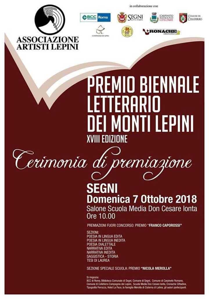 SEGNI – Domani, Domenica 7 Ottobre, a partire dalle ore 10 presso il salone della Scuola Media “Don Cesare Ionta” di Segni, avrà luogo la cerimonia di premiazione del Premio Biennale Letterario dei Monti Lepini, giunto quest’anno alla sua XVIII edizione (qui sopra alcune immagini della precedente edizione).