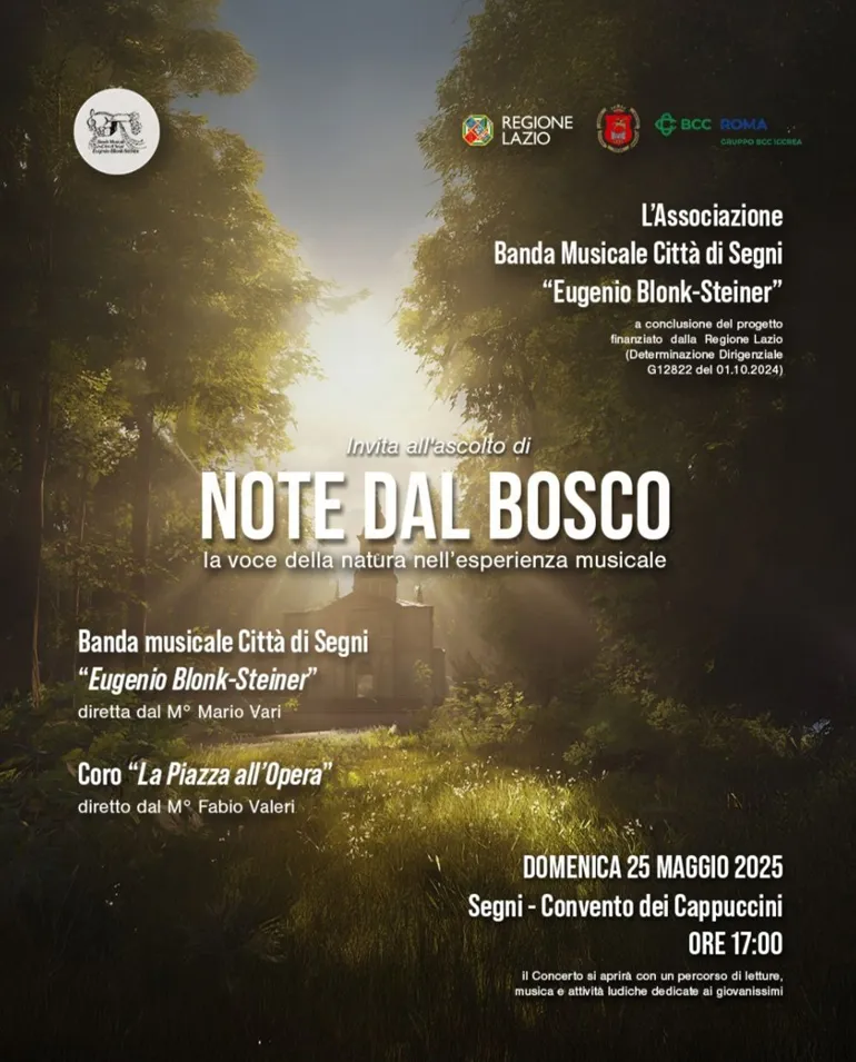 “Note dal bosco: la voce della natura nell’esperienza musicale” è un progetto elaborato dall’Associazione Banda Musicale Città di Segni “Eugenio Blonk-Steiner” con lo scopo fondamentale di valorizzare la musica bandistica, la riflessione e l’apprezzamento degli ambienti naturali e paesaggistici di cui il nostro paese è ricco.