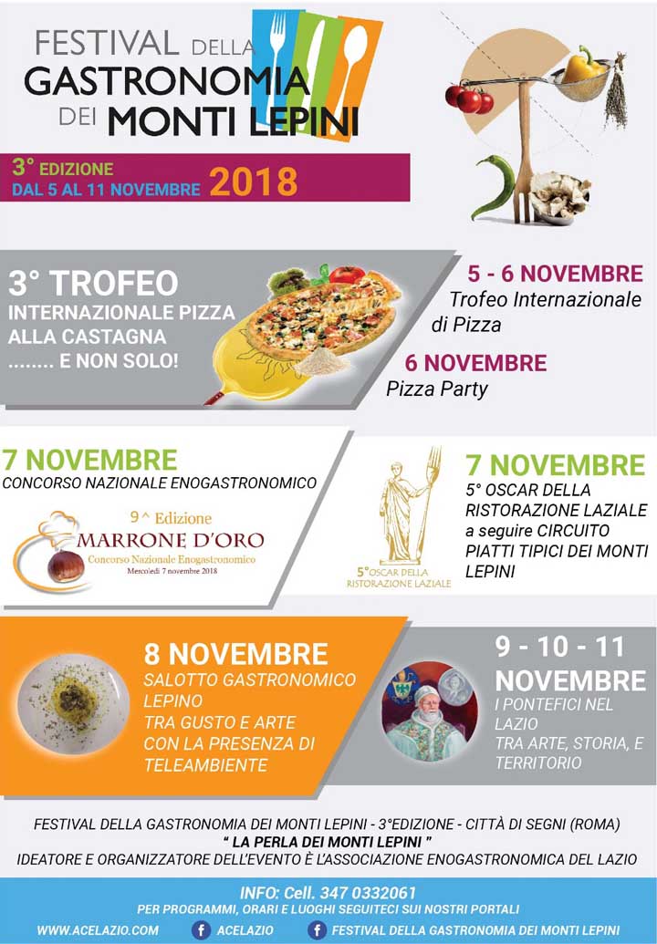 Questa 3^ edizione del Festival della Gastronomia dei Monti Lepini – sponsorizzata dalla Banca di Credito Cooperativo di Roma e realizzata in collaborazione con I’Associazione Professionale Cuochi Italiani (Apci Lazio) – si presenta, da un lato, come una valida opportunità per aprire la città di Segni e tutto il territorio dei Monti Lepini al mondo, dall’altro, come un appuntamento imperdibile per tutti coloro che, a qualsiasi titolo, si interessano di cibo e attorno ad esso vogliono riflettere, conoscere, emozionarsi, divertirsi, fare impresa.