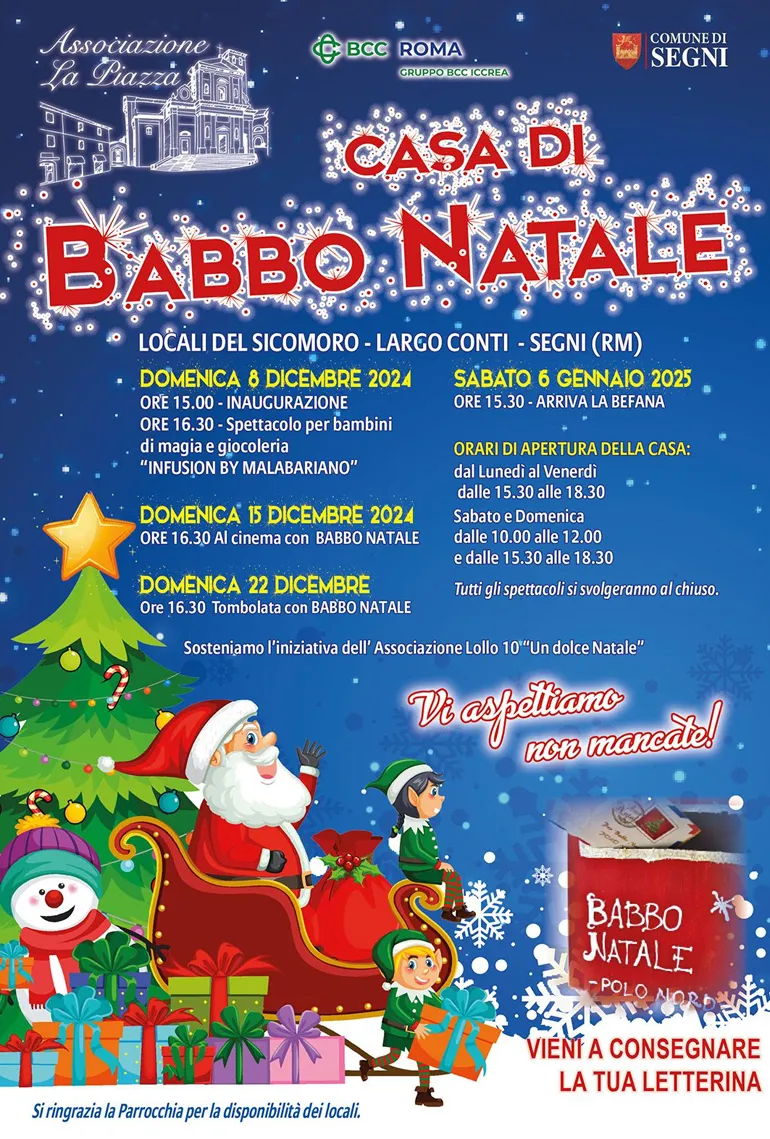 SEGNI – Anche quest’anno l’Associazione “La Piazza” di Segni, con il contributo del Comitato Soci della Banca di Credito Cooperativo di Roma, ha rispettato l’appuntamento natalizio con i bambini (ed anche con i grandi) dell’allestimento della Casa di Babbo Natale (nona edizione) – presso i locali del Sicomoro in Largo Conti – aperta al pubblico già dal 15 Dicembre e fino al 6 Gennaio 2025.