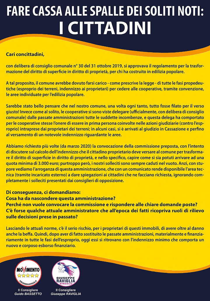 Abbiamo richiesto più volte (da marzo 2020) la convocazione della commissione preposta, con l’intento di discutere sul calcolo dell’indennizzo che il cittadino proprietario deve versare al comune per trasformare il diritto di superficie in diritto di proprietà, e nello specifico, capire come si sia potuti arrivare ad una quota minima di 3.000 euro; purtroppo però, i nostri solleciti sono sempre caduti nel vuoto.