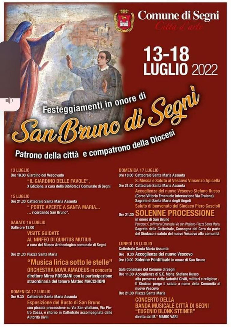 Lunedì 18 Luglio – il giorno in cui si celebra il Santo Patrono – alle ore 9,30 il nuovo Vescovo S.E. Rev.ma Mons. Stefano Russo verrà accolto in Cattedrale ed officerà il Solenne Pontificale in onore di San Bruno.