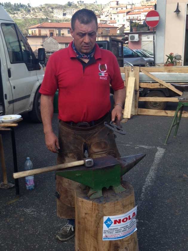 Intanto arrivavano i maniscalchi e due cavalli, il cestaio Danilo, due pecorelle e tanto latte portato da Enea, pronto per essere lavorato. Mentre Stefano “Baffitto”, forgiatore di livello internazionale, faceva letteralmente “cantare” i colpi di mazzetta sul ferro rovente, il cestaio iniziava pazientemente ad intrecciare e, le pecorelle, libere di scorazzare nella piazza, conquistavano il folto pubblico di bambini, increduli e gioiosi davanti a loro.