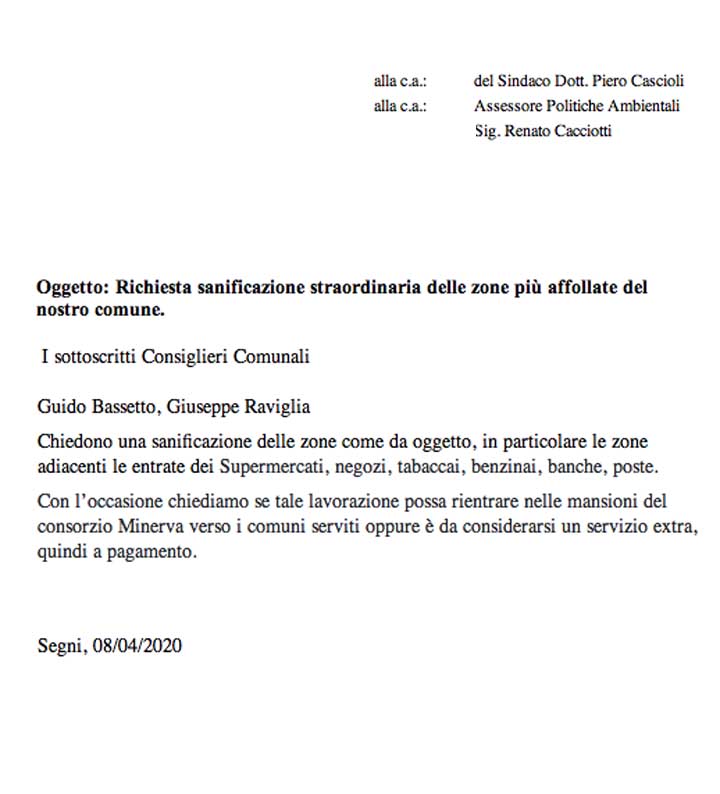 SEGNI – I Consiglieri comunali di opposizione Guido Bassetto (M5S) e Giuseppe Raviglia (Raviglia Sindaco) hanno protocollato nella giornata di ieri, 8 Aprile, la “Richiesta di sanificazione straordinaria delle zone più affollate” del Comune di Segni.