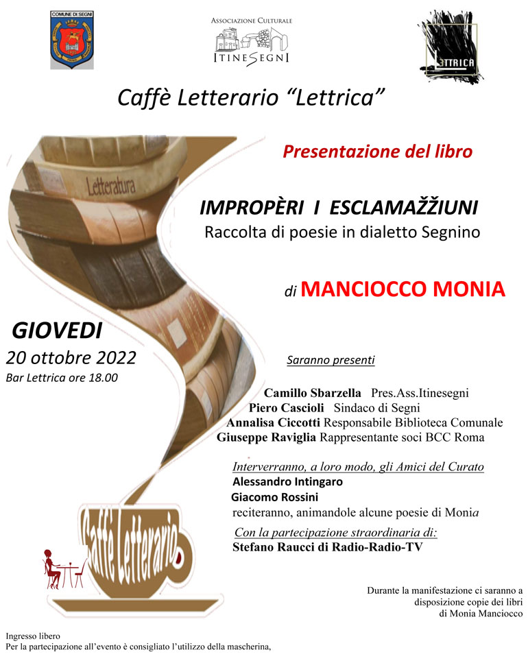 SEGNI – In occasione dell’apertura delle manifestazioni della 65^ Sagra del Marrone Segnino, il Presidente dell’Associazione Culturale Itinesegni, Camillo Sbarzella, presenterà presso il Caffè Letterario “Lettrica” di Segni, il nuovo e affascinante lavoro di Monia Manciocco: “Impropèri I Esclamažžiuni” – Raccolta di poesie in dialetto segnino.