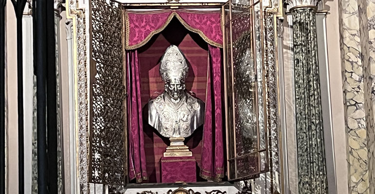 Subito prima della conferenza stampa, S.E. Rev.ma Mons. Stefano Russo, accompagnato da Don Daniele Valenzi, hanno dato apertura alla nicchia contenente il mezzobusto di San Bruno custodito all’interno della Cappella dedicata al Santo normalmente chiusa da una cancellata in ferro battuto e da una balaustrata in pietra segnina.