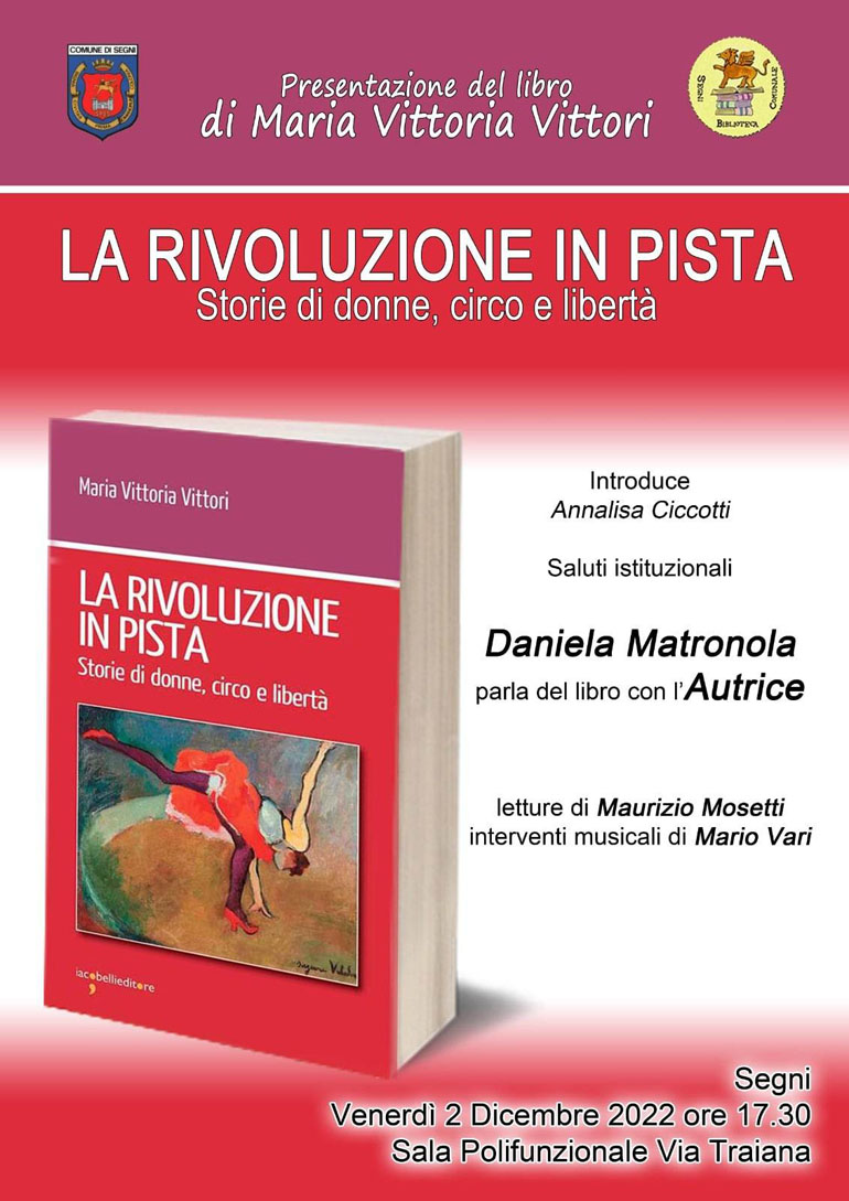 SEGNI (Eledina Lorenzon) – Sarà presentato Venerdi 2 Dicembre alle ore 17.30, alla Sala Polifunzionale di Via Traiana a Segni, il libro di Maria Vittoria Vittori dal titolo “La rivoluzione in pista – Storie di donne, circo e libertà”, Iacobelli Editore.
