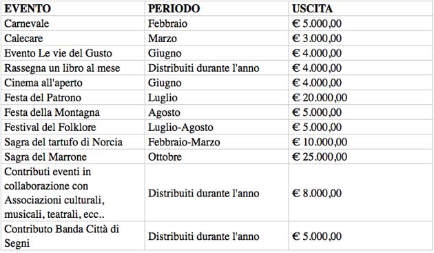 Relativamente alla incapacità di programmare, come afferma la Vittori, si puntualizza che ogni Assessore presenta ad inizio anno una previsione delle spese da impegnare per l’attività attinente al proprio Assessorato , a esempio mostriamo quanto previsto dall’Assessore alla cultura nella seguente tabella.