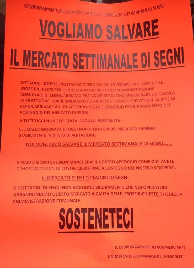 2) Segni. “Lotta senza quartiere” tra i commercianti del “mercato del mercoledì” e l’Amministrazione comunale. Raccolte oltre 600 firme •>