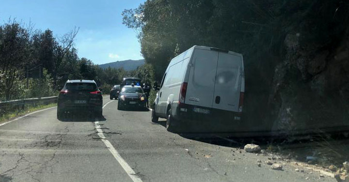 Segni. Su Via Montelanico un masso si stacca dalla montagna e colpisce in pieno un furgone in transito. Illeso il conducente