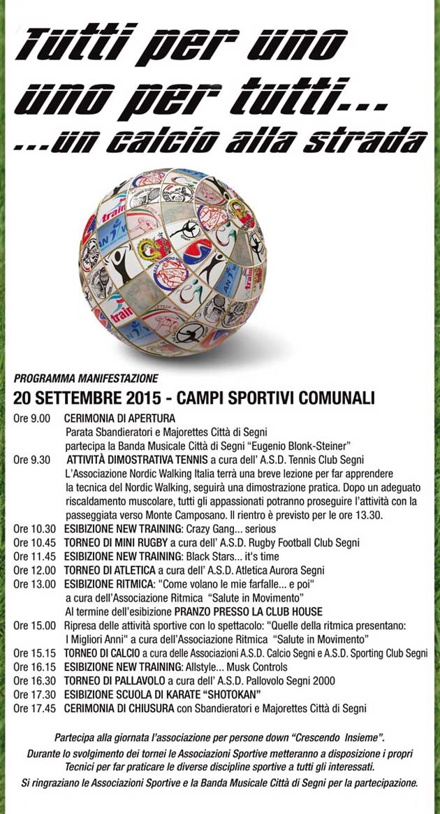 SEGNI (RM) – Sarà grande giornata di Sport domani, Domenica 20 Settembre, ai campi sportivi di Segni dove, all’insegna di “Tutti per un, uno per tutti… Un calcio alla strada”, ciascuna delle diverse associazioni sportive che operano in paese mostrerà il meglio di sé.
