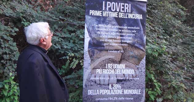 Lungo il percorso sono stati posizionati i pannelli della Mostra dedicata proprio all’Enciclica, con le frasi che maggiormente riguardano la difesa del creato, l’invito al dialogo, al dovere della denuncia, all’impegno per lavorare insieme con l’invito a metterci in viaggio sia dentro di noi e lungo le strade del mondo. Siamo tutti dei viandanti su questa terra e dobbiamo sempre più avere la consapevolezza che non può realizzarsi una vera “ecologia integrale”, come quella che Papa Francesco indica nella “Laudato sì”, se non comprendiamo che siamo custodi e non padroni di questo nostro pianeta chiamato terra e dobbiamo avere rispetto per i doni che ci vengono elargiti, evitando «sprechi di energia, cibo e consumo di suolo», avendo rispetto sia per i luoghi che per le culture altrui.