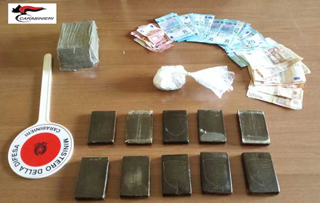 L’uomo è stato trovato in possesso di 1 Kg di hashish e 102 gr. di cocaina purissima.