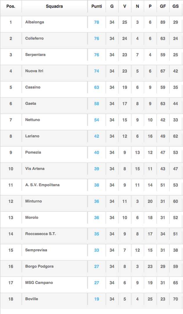 COLLEFERRO (RM) – Nel Girone B del Campionato di Eccellenza la rappresentativa rossonera del Ssd Colleferro Calcio ha chiuso classificandosi al 2° posto con 76 punti a pari merito con la squadra Serpentara di Bellegra e Olevano (vedi classifica in pagina).