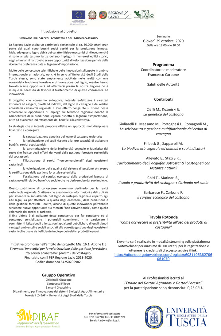 Il seminario – realizzato nell’ambito del progetto finanziato dal PRS Regione Lazio, Mis. 16.1 – intende enfatizzare i caratteri intrinseci ed esogeni, diretti ed indiretti, del legno di castagno e dei relativi ecosistemi castanicoli regionali. Il loro effetto congiunto si ritiene possa accrescere le opportunità di impiego sul territorio regionale nonché la competitività della produzione legnosa rispetto ai legnami d’importazione, oltre ad assicurare indirettamente dei benefici alla collettività.