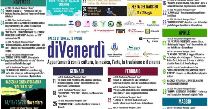 Rocca Priora. Riparte la Rassegna Culturale “diVenerdì”: tantissimi appuntamenti dal 28 Ottobre 2018 al 12 Maggio 2019