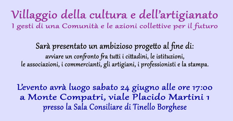 MONTE COMPATRI (L.V.) – Il 24 Giugno nella Sala Consiliare avrà luogo il Convegno sul “Villaggio della cultura e dell’artigianato”